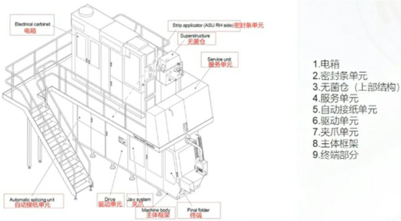 包材滅菌的場所,所有用于灌裝的包材都會在無菌倉里過一下雙氧水倉,出來后擠壓輪會刮掉大部分的雙氧水,殘留部分會通過加熱給蒸發(fā)掉。